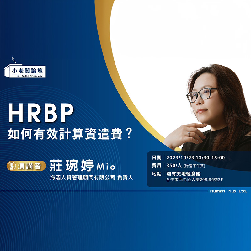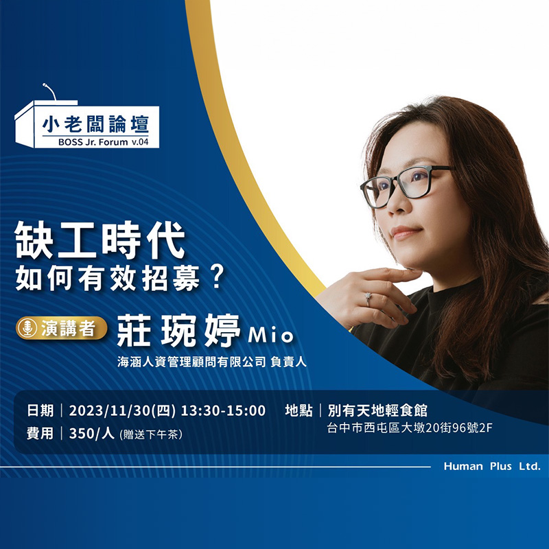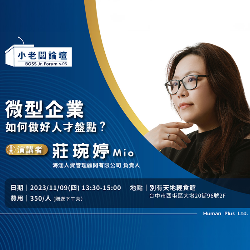 最新消息 《 海涵人資 x 小老闆論壇 》 + 策略型商業人資顧問開講,歡迎各位夥伴及好朋友們幫忙引薦此課程給身邊的創業者、有計劃創業或對人資議題感興趣的對象。 1️⃣專題講座 缺工時代-如何有效招募 2️⃣活動時間 2023/11/30(四)13:30 3️⃣活動地點 西屯區大墩20街96號 特別提醒您,本活動提供自助式下午茶。為保留席位,請優先填寫報名表格如下,期待您的與會。 報名表單 《 海涵人資 x 小老闆論壇 》 + 策略型商業人資顧問開講,歡迎各位夥伴及好朋友們幫忙引薦此課程給身邊的創業者、有計劃創業或對人資議題感興趣的對象。 專題講座🔰 微型企業如何做好人才盤點 活動時間🔰2023/11/9(四)13:30 活動地點🔰西屯區大墩20街96號 特別提醒您,本次因活動現場座位有限,我們提供免費的下午茶及飲料選擇,請優先填寫報名表格如下: 報名表單 「人資小姐,幫幫忙」 + 我們的Podcast節目「人資小姐,幫幫忙」 今天在SoundOn上架囉! SoundOn 【HRBP 如何有效計算資遣費?】講座 + 演講者| 莊琬婷Mio 海涵人資管理顧問有限公司 負責人 日期| 2023/10/23 13:30-15:00 費用| 350/人(贈送下午茶) 地點| 別有天地輕食館 台中市西屯區大墩20街96號2F 報名表單